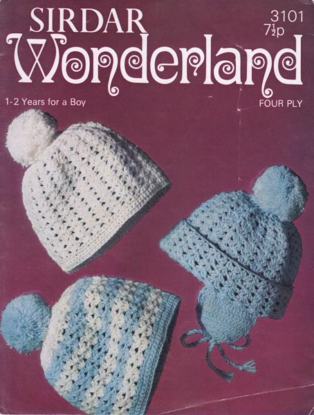 Sirdar 3101: Great vintage crochet pattern for hats for little boy 1-2 years, can be made with or without pompom. Round head 12 inches and 16.5 inches. 1970's. Pattern has some creases, but is sound and clean.