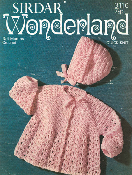 Sirdar 3116: Pretty crochet matinee set for baby 3-6 months in quick knit, use 4ply for a little smaller or double knitting for a little large, adjust hook accordingly.