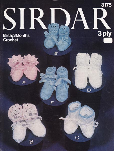 Sirdar 3175: Great vintage crochet pattern for baby bootees, 6 different designs for the first 3 months worked in 3ply. Same as 3018 above, only newer version. Pattern from the late 1979's or possibly the early 1980's in very good condition.