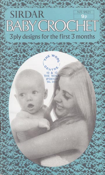 Sirdar 9921: Vintage crochet book for baby first three months. This lovely book has 32 pages of pretty patterns including general how to pages, and close ups of the crochet stitches used. There are instructions for hooded jacket, matinee jacket, layette with dress, jacket, shawl and bootees bonnet and mitts, a carrying cap, so pretty , an easy to make motif jacket (squares) and a cardigan - lots of projects, mostly simple stitches - full instructions on how to work the stitches required. Worked in vintage 3ply so work tension square to see in modern 4ply might work better or just a change of hook - dainty, pretty retro designs for modern babies.