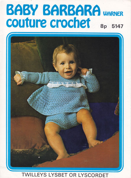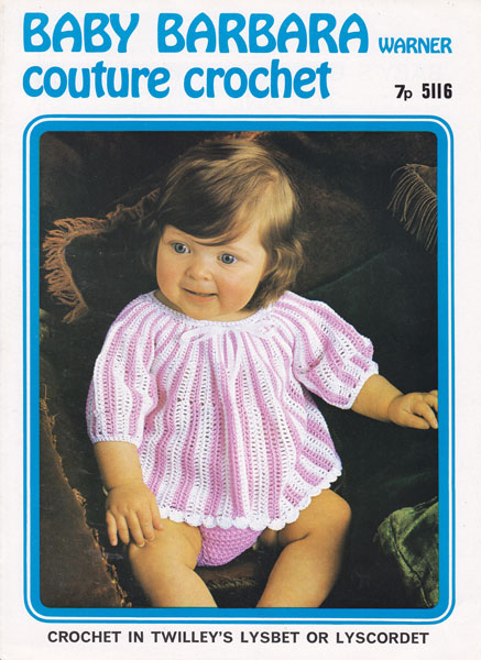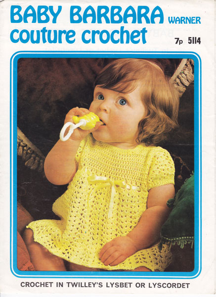 Twilley's 5114: Very pretty vintage crochet pattern for baby girl's dress in cotton from 1970, chest sizes, 22", 24", 26" worked in Twilley Lysbet cotton, not sure of ply, but try a tension piece in no 20 and see if you need thinner or thicker or just to change hook. Pattern is in great condition.