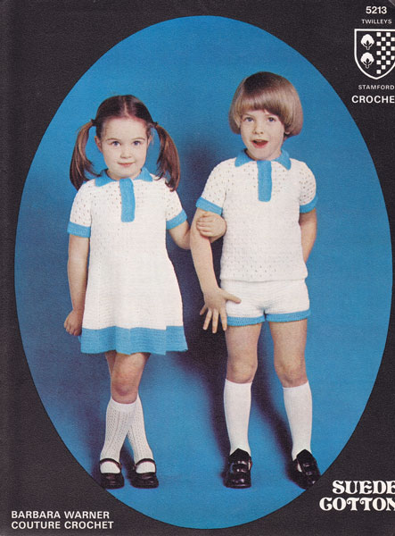 Twilley 5213cr: Great vintage childs crochet pattern top, shorts, dress 1970s. This fabulous pattern has instructions for a dress, shorts and polo top for boys and girls in crochet Suede Cotton no 5, try tension square with modern no5 if you cannot get this yarn and change hook to suit. The tension is 6 trebles and 4 rows to an inch (3cm) on 3mm hook.