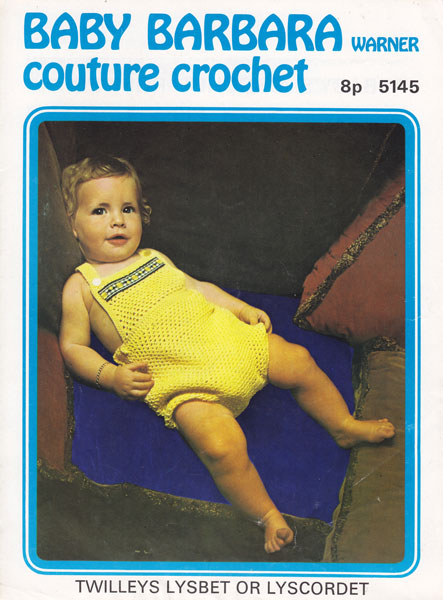 Twilley 5145cr: Great vintage baby crochet pattern romper sun suit 1970s. Great little pattern for a sun suit in cotton, try modern no20 in a tension square 3 half treble groups to an inch and 4 rows to give you a guide on hook no3mm or old 10. To fit 20 and 22 inch chest. Pattern is in very good condition.