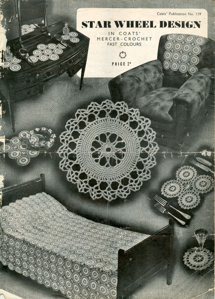 Coats 202cr: Vintage crochet pattern spinning wheel motif 1940s. Illustrations for use in a table cloth, try cloth, duchess set. There are instructions for the motif shown. Wear to edges, small splits to bottom edge, Don't forget that you can make jug covers by sewing beads to the edges of the mats! original as shown and described £1.50