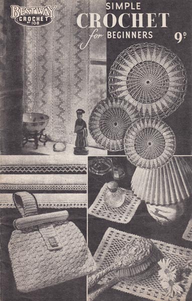Bestway 108G: Great little vintage pattern book from 1940's with many gifts to crochet including mats and doilies, hand bag, lamp shade, edgings, collar, curtains and compact case. In various designs and cottons.