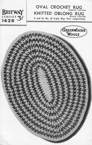 Bestway 1426: Great vintage crochet and knitting pattern for rug 1940s. This is a lovely pattern for two rugs, this one is the crochet on and is ova, it measures 48 inches by 37 at the widest point and is crocheted all in one peice. Worked on a large hook, no size but life size diagram give to show size suitable. It will take about 50 balls of wool (50g) (5 x 1bs of rug wool which is 80oz and there are about 30g in an old 1oz ball) Original pattern in good condition feint crease across centre. There are also instructions knitted rug included in this pattern. original pattern with both designs £2.00