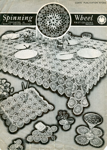 Coats 202cr: Vintage crochet pattern spinning wheel motif 1940s. Illustrations for use in a table cloth, try cloth, duchess set. There are innstructions for the motif shown. Wear to edges, small splits to bottom edge, Don't forget that you can make jug covers by sewing beads to the edges of the mats! original as shown and described £1.50