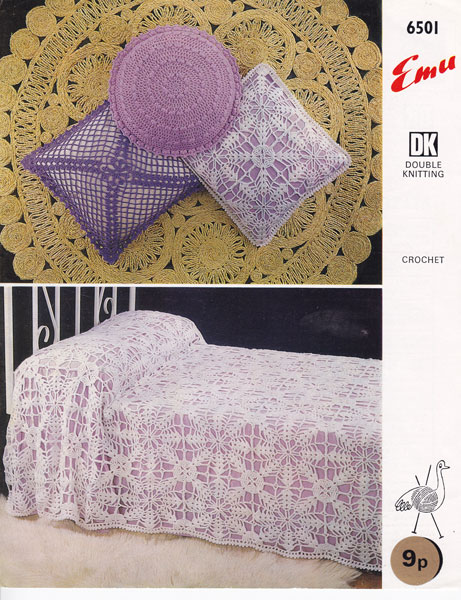 Emu 6501cr:Great vintage cushion bedspread crochet pattern 1970s. This lovely pattern has instructions for the three different cushion covers and the fabulous bedspread all worked in double knitting wool, put a pretty plain cover under the delicate crochet cover spread and match the lining in the cushions, the lavender in the photo looks fabulous. Worked on a 4.50mm hook. The cushions measure 18 inches square, bedspread 73 x 91 inches, but obviouisly can be made larger, allow more wool if you do this. Pattern in great condition. colour All images and text on this website are copyright fab40s.co.uk and are for reference and historical interest only You can email sue@fab40s.co.uk |