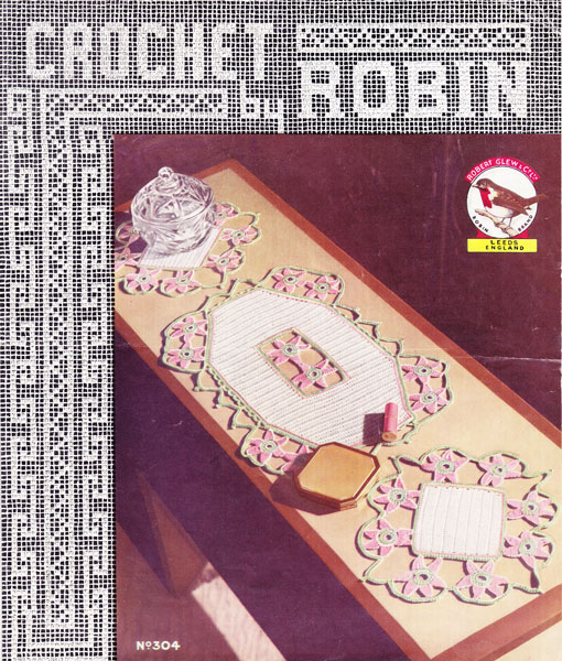 Robin 304cr: Great vintage crochet pattern dressing table set 1940s. Lovely coloured mats for dressing table or sideboard, worked in Robin Perle, which I believe was a 4ply type of yarn with a shine, so any silky looking cotton around no20 or yarn will work. Pattern in very good condition. original pattern as shown £2.00 colour All images and text on this website are copyright fab40s.co.uk and are for reference and historical interest only You can email sue@fab40s.co.uk