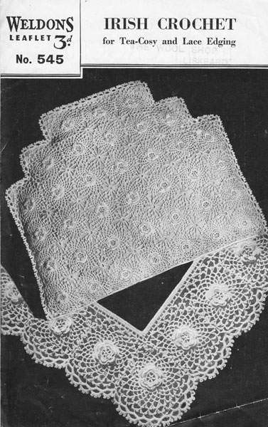 Weldon 545cr: Fabulous vintage teacosy edging Irish crochet pattern 1940. This pattern has instructions for the teacosy shown and edging for tray cloth, table clothe, serviettes or as an insert for blouse or nightdress. Teacosy measurements 14.5 wide by 11.5 high approx. Worked in no 60 cotton and hook old size 6.5 Pattern in very good condition. original pattern as showm £2.50