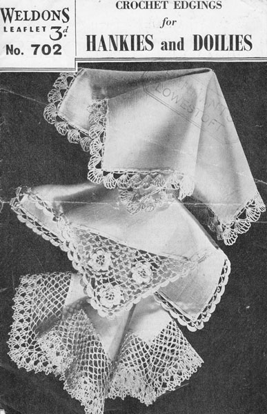 Weldons 702cr:Great vintage edgins crochet pattern 1940s. This one also has some very pretty edings to crochet, a chell edging, an Irish lace in sertion and wide lattice edging. Worked in no30 cotton. Pattern has a crease, but is clean and sound original pattern as shown £2.00