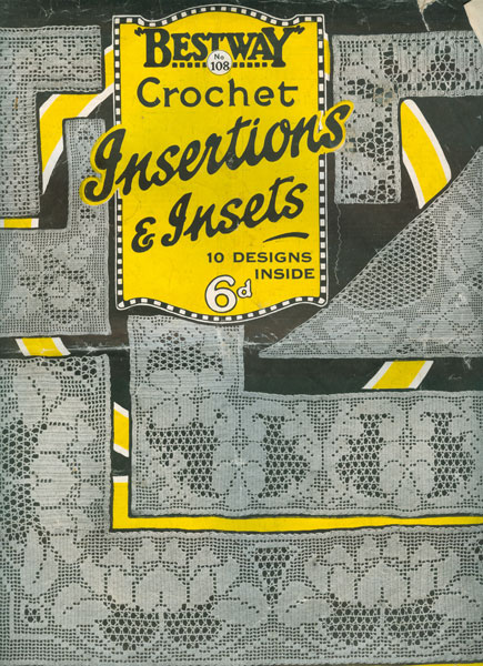 Bestway 108cr: Vintage crochet insertions and lace insets. Again from the 1920's this one is in nice condition with wear to edges and a crease, spine split and a bit weak. 12 designs. Sorry too big to scan a photocopy. original booklet £5.50