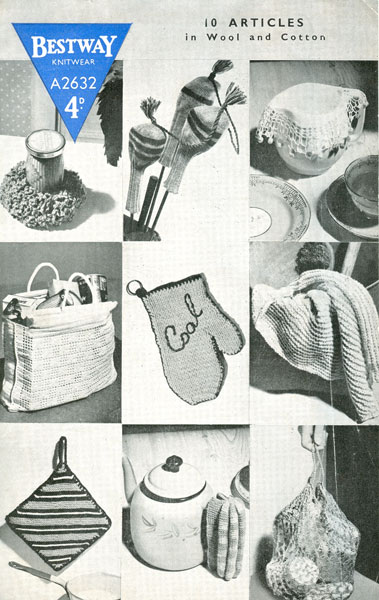 Bestway A2632cr: Great vintage range of crochet gifts with the retro feel, this pattern is from the 1940's when home made gifts were gratefully recieved. There are instructions for shopper and a string bag , golf cosies, mug or plant stand, milk cover, tea cosy, oven glove and pot holder, to be crochet in cotton or wool.
