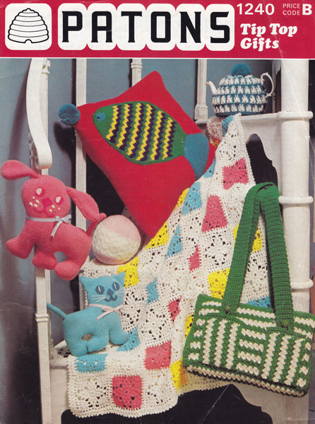 Patons 1240G:Great vintage gifts knitting pattern 1975. Fabulous selection of things to knit and crochet, a fun fish cusion, traditonal tea cosy, toy dog, toy cat and ball. and to crocht a pretty cot blanket ( or knee blanket) and a great bag. Pattern in great condition. pattern as shown £2.00 colour All images and text on this website are copyright fab40s.co.uk and are for reference and historical interest only You can email sue@fab40s.co.uk |