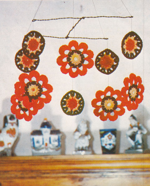 Patons 190-flower mobile: Great vintage flower mobile 1974. All trendy homes had at least one of these - we had several! These are support by a simple wire cross peice, but cane or wood can be used. You cna make any motifs you like, there are lots through out the site that would suit. To fit 10 inch diameter frame. Work quite tightly so that the finished motifs are stiff - if needed spray starch them. You get both mobiles in the same pattern. colour photocopy £1.50 pdfs £1.25 |