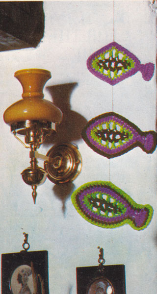 Patons 190-Fish Mobile: Great vintage fish mobile in crochet 1974. All trendy homes had at least one of these - we had several! I even did some birds and butterflies - they we very 'in' at the time and are due for a comeback! Work tight to give firmness and link with thick cotton or coloured string or cord - or you could make a cord from the colours used. Babies will love these over their cot or from their pram hood. You get both mobile in the same pattern. colour photocopy £1.50 pdfs £1.25 |