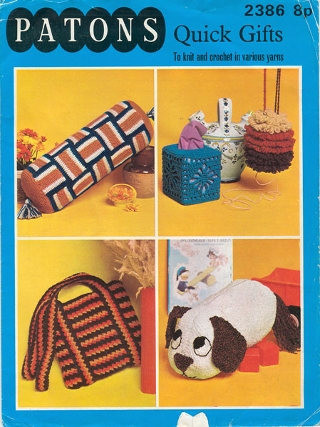 Patons 2386: Quick Gifts to knit for Christmas vintage knitting pattern. Fabulous bolster cushion, tissue box cover, string holder, shoulder bag and puppy pyjama case all in double knitting wool and easy to make. colour All images and text on this website are copyright fab40s.co.uk and are for reference and historical interest only You can email sue@fab40s.co.uk |