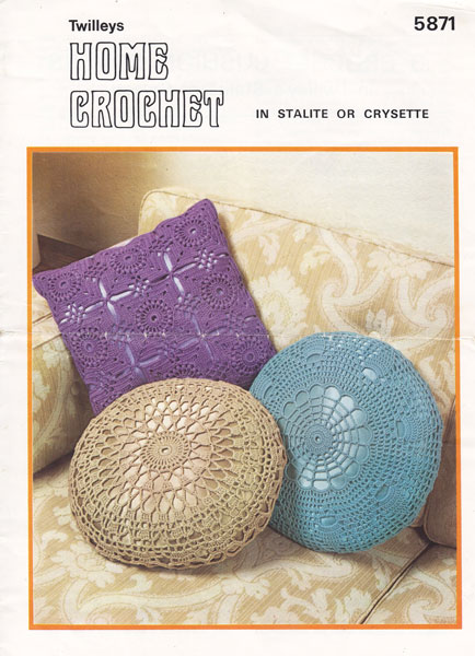 Twilley 5871cr: Great vintage cushion cover crochet pattern 1970s. This pattern has three different designs, two for round cushions and one square cover. A 3.50mm hook is used, but no cotton nbumber only name Stalight or crysette, which I think was similar to no20 or 3ply yarn. The cusions measure 19 and 20 inches across for the two round ones and 21 inches square for the square one. Pattern is worn with a crease to front. original pattern as shown and described £1.50 colour All images and text on this website are copyright fab40s.co.uk and are for reference and historical interest only You can email sue@fab40s.co.uk |