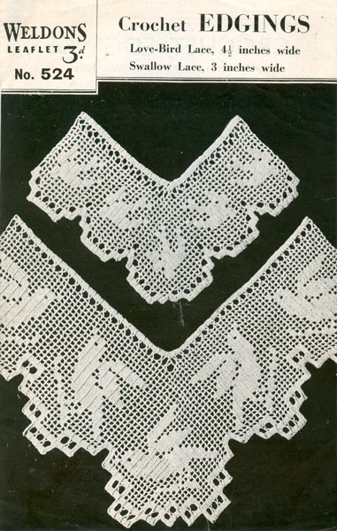 Weldon 524cr: Vintage crochet edging pattern with love birds and swallows - so pretty. 1930's or 1940's. Worked in 70 cotton no 6 imperial hook. Pattern in great condition. original pattern as shown £2.50
