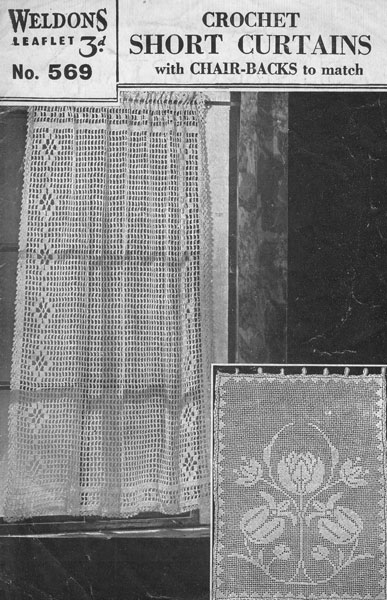Weldons 569cr: Great vintage crochet curtain pattern 1940s. This is a super pattern for short curtains and chair backs - these curtains would look great int the windows of a cottage as well as a modern flat, how about the caravan or campervan? Get the retro look this summer. Worked in no40 cotton. Pattern is in very good condition. original pattern as shown £2.50