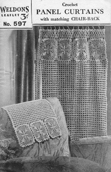 Weldon 597cr: Great vintage crochet pattern curtains chairbacks 1940. Another lovely pattern for curtains and chairbacks from the war time, would great in modern or vintage setting dare to be different! Sew beads to edges and create a gypsy look. Worked in no18 cotton. Pattern in nice condition, little wear to edges. original pattern as shown £2.50