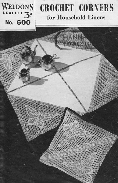 Weldons 600cr :Great vintage mat cushion crochet pattern 1940s. This is lovely with stunning butterfly in filet crochet, so retro and so pretty and delicate. There are instrutions for the corners and how to make the cloth and also the cushion. These motifs could be used for many things including a bedspread or insertion for nightdress. Worked in no40 cotton. Pattern in very good conditon, very collectable. original pattern as shown £2.50