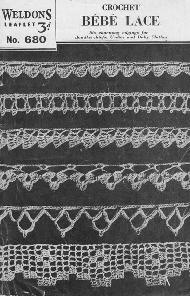 Weldon 680cr: Great vintage edgings crochet pattern 1940s. This is very useful pattern for 6 different tiny edgings ideal for baby clothes trimming, underwear, hankies or small doilies. Worked in no60 cotton. Pattern is in great condition original pattern as shwon £2.00