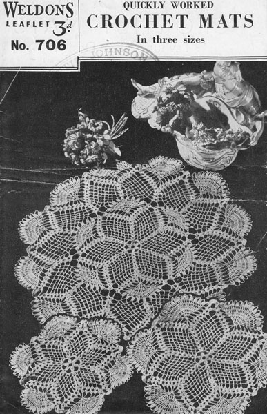 Weldon 706cr: Great vintage crochet pattern 1940s. This lovely pattern is in the fan design and worked in no30 cotton. There are instructions for thee sizes, very retro styling, great for outdoor eating this summer. Sew large glass beads to edges and have jug or cup covers. Original pattern in good condition, with crease to centre. original pattern as shown £2.00