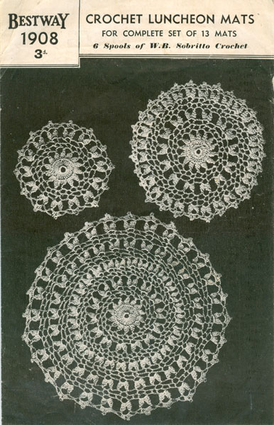 Bestway 1908cr:Vintage crochet pattern luncheon mats. These delicate little mats make great jug covers, sew on beads or work them in as you crochet. 3 different sizes. 1930's Pattern in good condition. original pattern as shown £2.00