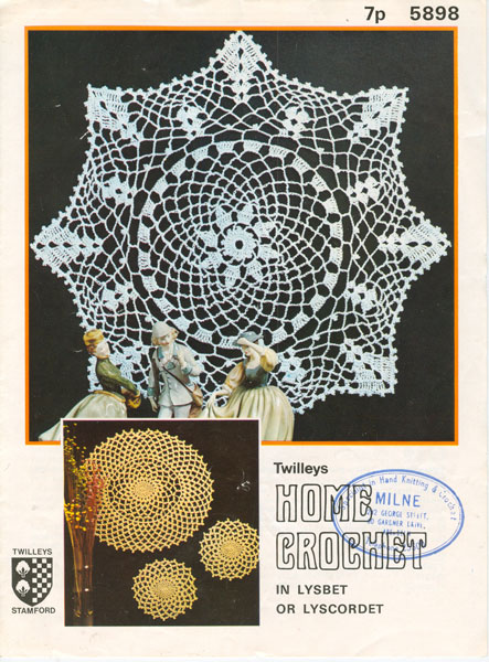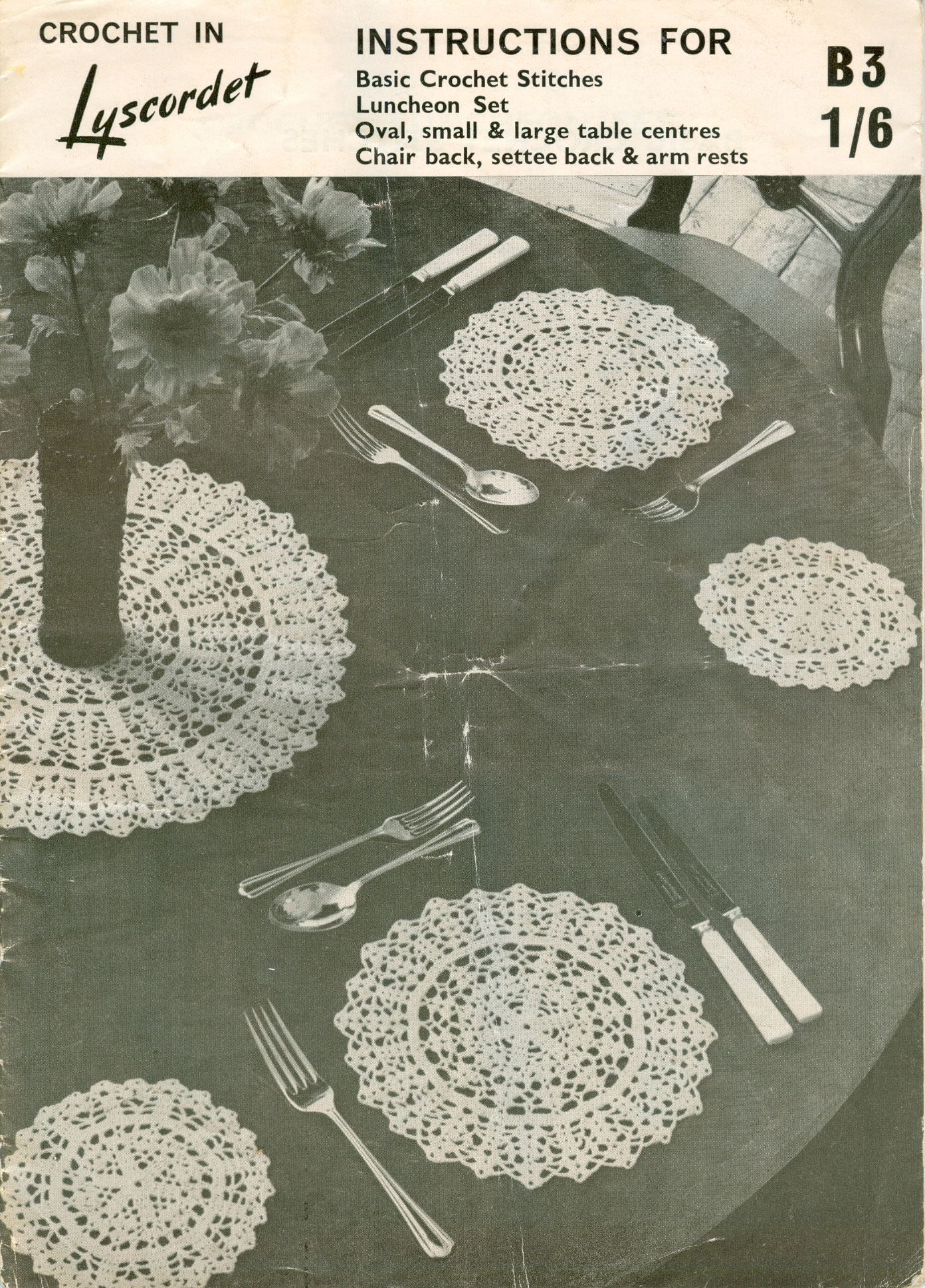 Lyscordet B3cr: Vintage crochet booklet for Luncheon set, oval, small and large centres, chair back, setee back and arm rests. These delicate little mats make great jug covers either work in beads around the edges or sew them on afterwoards, very chic! 1960's Pattern in nice condition with wear on edges and small split to spine at bottom. original pattern as shown £2.00 pdf £1.99 |