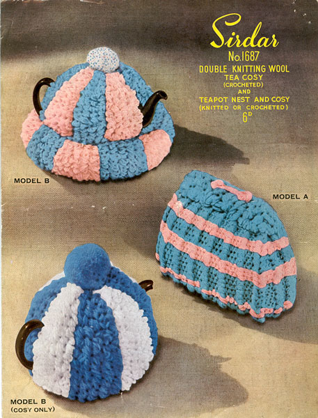 Sirdar 1687: Vintage knitting pattern for 2 different tea cosy designs and a nest, which is great for keeping the bottom of the tea pot warm. Pattern B can be knitted or crochet, instructions are included for both, pattern A is for crochet, in double knitting yarn. Pattern a bit worn at edges. 1950's original pattern as shown £2.00 colour All images and text on this website are copyright fab40s.co.uk and are for reference and historical interest only You can email sue@fab40s.co.uk |