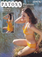 *Patons 2216: Great vintage ladies Bikini crochet pattern 1972. This will fit 32-33 and 34-35 inch bust and is worked in probably a 4ply yarn. Work a tension square and check this. You could always line the panties and bra if needed. Pattern has a crease to bottom right hand corner, but is clean and sound.