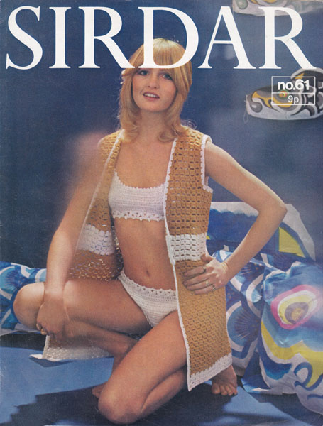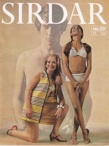 Sirdar 29sw: Great ladies bikini knitting and crochet pattern form 1970 with striking beach jacket to fit 32", 34" and 36" bust. Beach jacket is knitted the bikini is crochet both in double knitting yarn. Very stylish.