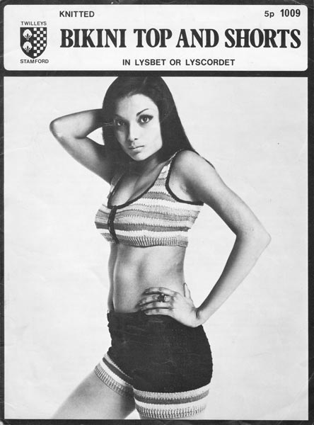 Twilley 1009sw: Fab 1970s knitting pattern for bikini to fit 32", 34" and 36" bust and hips 34", 36" and 38" pattern suggests black, blue, brandy, cherry, lemon or purple, hot pink, hot orange, fire red, canary yellow ! So 1970's !