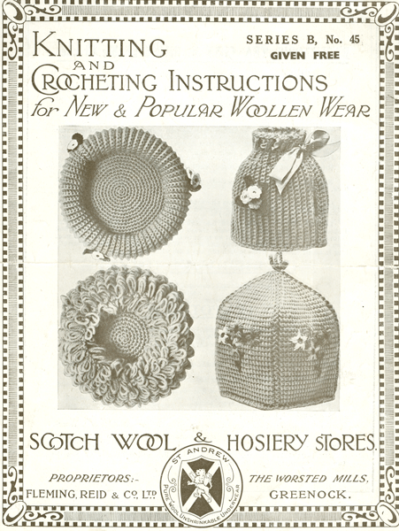 Greenock 45c:Vintage tea cosy pattern, one knitted tea cosy, two crochet and one loopy tea pot nest in crochet. This pattern is very old and in worn condition the crease has small tear at edge and so has spine crease, 1920's. To see more tea cosy patterns go to TEA COSIES page