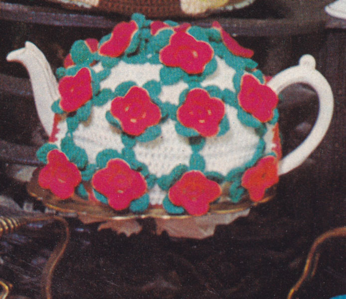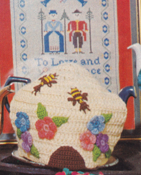 Patons 190- Flower Power Tea Cosy: Great vintage tea cosy crochet pattern with applique flowers