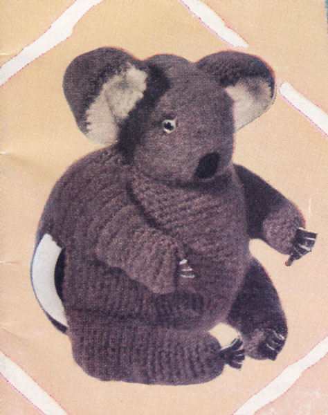 Patons C18-18: Great character tea copy, as this from an Austalian knitting book, not surprised to see a freindly Koala amongst the great designs. again in thick wool chunky, aran etc, this one needs a little felt or leather for paws - this one is in CROCHET and brushed with a teasel brush to give him a furry look. 1960's Colour photocopy £1.50 pdf £1.25 |