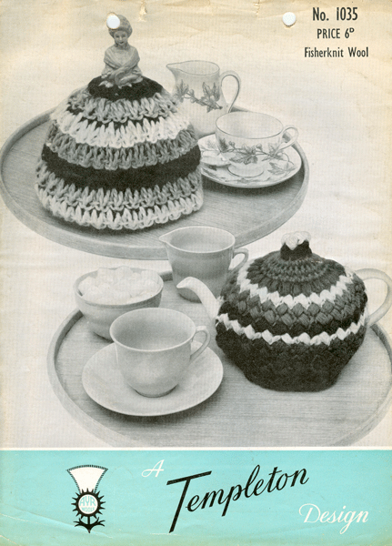 Templeton 1035: Great vintage 1950's tea cosy knitting pattern. Instructions for one knitted and one in crochet in fisheknit wool wich was similar to chunkky, or use double knitting doubled.