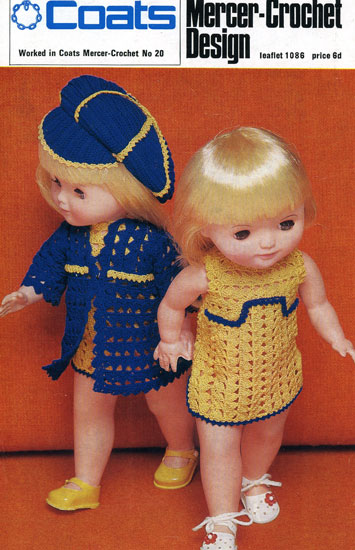 Coats 1086. Another lovely vintage crochet pattern for 12 inch doll. 1969. Name to top, scuff down spine, but clean and sound inside. Instructions for dress, coat and very retro baker boy hat.