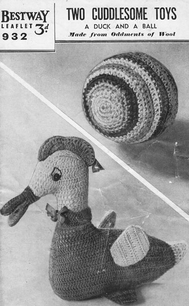 Bestway 932: Great 1940 vintage crochet pattern toy for duck and ball. Made from oddments, no sizes given, nice easy project for beginners. The original pattern has a few surface marks but is good condition for its 70 odd years of age! See crochet pages for more vintage toy patterns.
