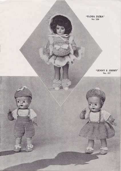 Doreens Dolls 102: Flora Dora, Jenny and Jimmy: Fabulous vintage crochet doll patterns 1951. Flora is a 8 inch doll dress, panties, bonnet and muff(can be made to fit Miss Rosebud) Jenny and Jimmy are 11 inch child doll instructions for skirt, trousers, shirt and cap and beret plus shoesFrom the USA so hook conversion chart will be sent. For tiny button suitable for these dolls see button pages.