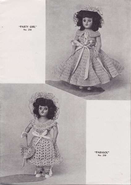 Doreens Dolls 102 : Party Girl and Parasol: Fabulous vintage crochet doll patterns 1951. Both these designs are to fit an 8 inch doll and can easily be mad to fit Miss Rosebud or similar dolls. There are instructions for both dresses, panties and hats including parasolFrom the USA so hook conversion chart will be sent. For tiny button suitable for these dolls see button pages.