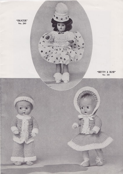 Doreens Dolls 102: Skater, Betty and Bob: Fabulous vintage crochet doll patterns 1951. Both patterns are for 8 inch dolls(can be made to fit the Suck-thumb-baby and Miss Rosebud) The Skater has instructions for dress and hat, sequins or beasds can be used as trim. Betty and Bob ouitfits are skirt and trousers, jacket and hat and bonnet and shoes. From the USA so hook conversion chart will be sent. For tiny button suitable for these dolls see tiny buttons on button pages.