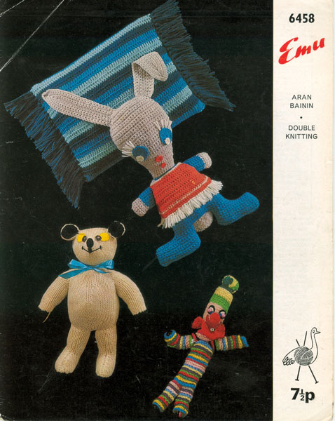 Emu 6458: Rare vintage knitting pattern from Emu with crochet rabbit, clown and pillow, with knitted bear from the 1970's. Pattern is worn at edges but in good condition.