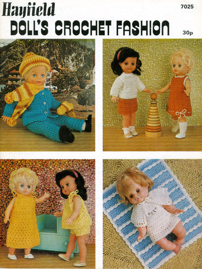 Hayfield Dolls Crochet Fashion: 7025: Vintage dolls CROCHET patterns to fit 12 - 20 inch dolls in very good condition 23 pages. 12 complete outfits! Jacket, trouseres, scaft, gloves, and hat in Double knitting to fit 12"-20" dolls , dress, jumper and skirt in 3ply, 4ply and DK to fit 12"-16", nightdress and baby doll pj's in 4ply to fit 12"-16", baby dress, shoulder cape, cover in 4ply and DK to fit 12-16" dolls, also there are instructions for skirt, bolero, button through dress, hat and jumper in DK, 3ply and 4ply to fit 12"-16" girl doll, dress with two different necklines in DK to fit 12"-16" doll, dress and waistcoat to fit 12"-20" girl doll in DK, dress with full skirt to fit 12"-20" girl doll in DK, 2 different A line dresses to fit 12"-20" girl doll in DK. Great selection. 1975