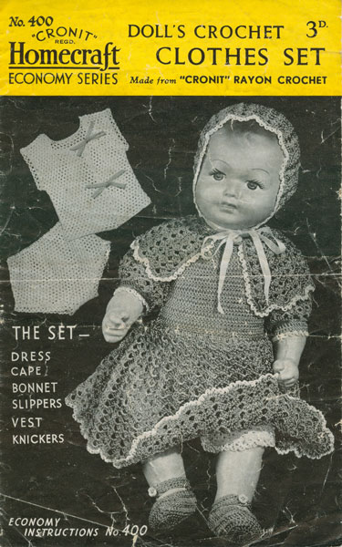 Homecraft 400: Great dolls CROCHET pattern for 16" doll another wartime pattern from early 1940's to work in rayon. Instructions for dress, bonnet, cape, slippers, vest and pants.