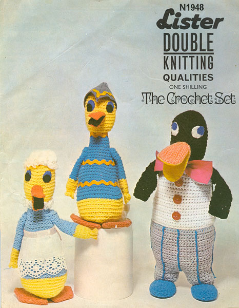 Lister N1948: CROCHET vintage duck and penguin pattern. The penguin meaures 12", the ducks 8" in double knitting. Pattern is in good condition