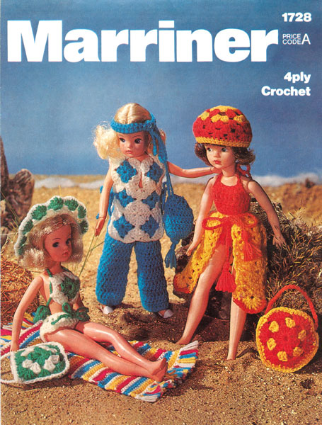 Marriner 1728: Vintage SINDY CROCHET pattern for beach set for Sindy and other fasion dolls in 4ply crochet early 1980's, consists of beach mat, 3 bags, 2 hats and head band, 2 bikinis and top and trousers set. In wonderful condition.