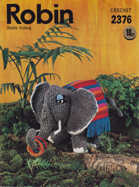 Robin 2376: Fabulous crochet elephant worked in double knitting from the 1970's. 12" high. Kids will love his colourful blanket and sleepy eyes. Great fun.