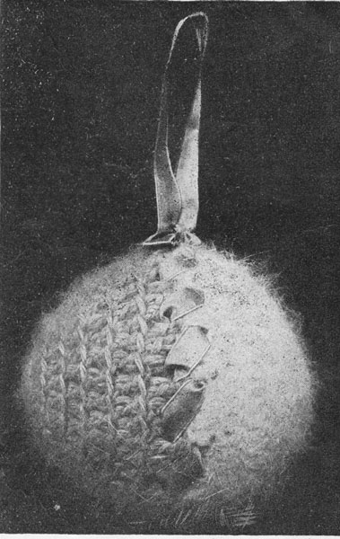 Weldons 21: Fuzzy ball with ribbon trim: This is a vintage crochet pattern for a pretty pram toy. It is for a croched ball in angora (bunny wool) and is fully washable, a new idea at the time. This pattern is from the 1920's. Very pretty. No size given.